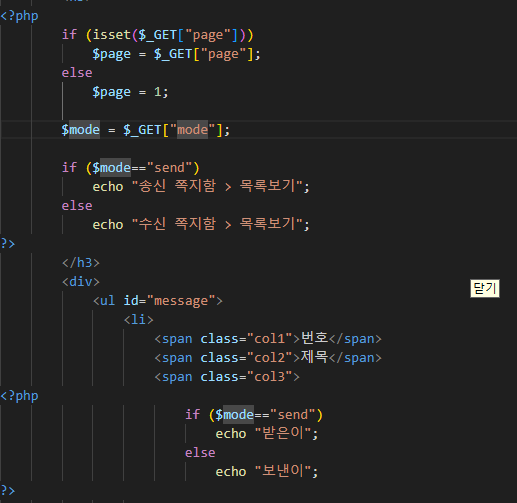 역시 db에 접속하여 데이터를 가져오는데 이전과 다른 것이 있다면 내가 보낸 입장인지 아닌지에 따라 가져오는 것이 다릅니다