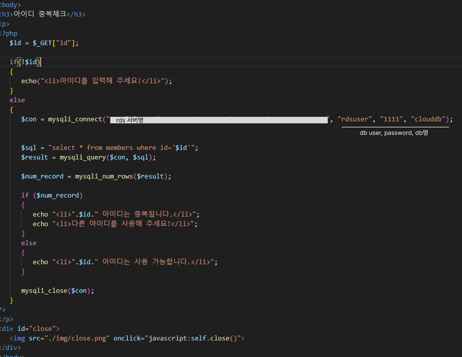 여기서 아이디 중복체크를 할 수 있습니다 아이디 중복체크는 member_check_id.php의 창을 열어 진행됩니다.