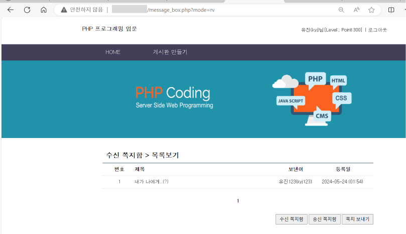 kyj123에서 로그아웃하여 kyj 로 다시 로그인 한 후 확인한 쪽지함입니다