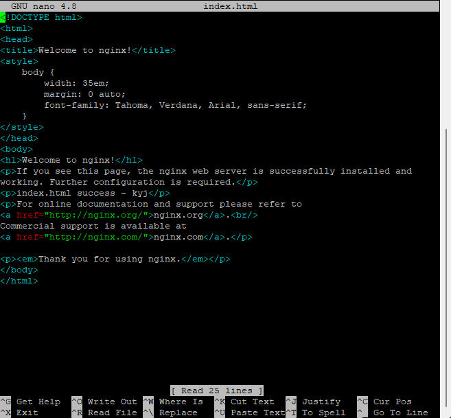 수정한 index.html파일을 내가 확인하기 쉽도록 nano index.html 명령어를 통해 조금 수정해보았습니다