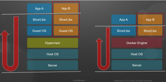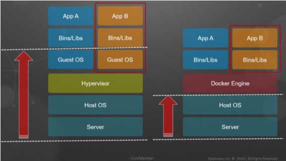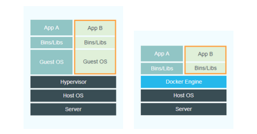 가상화된 애플리케이션에는 애플리케이션 자체와 이것에 필요한 바이너리/라이브러리뿐만 아니라 운영체제 전체가 포함되는 반면, 도커 엔진 컨테이너는 애플리케이션과 실행에 필요한 최소한의 바이너리/라이브러리만 갖추고 있습니다.