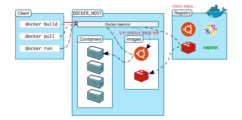 클라이언트에서 명령을 하면 도커데몬을 거쳐 이미지를 생성하거나 생성한 이미지를 이미지 저장소인 레지스트리에 올릴 수 있습니다. 여기서 이미지는 컨테이너를 생성하기 위한 내용들을 담은 읽기 전용 템플릿입니다.