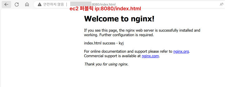 주소창에 본인의 ec2 퍼블릭 ip:8080/index.html 치고 들어가면