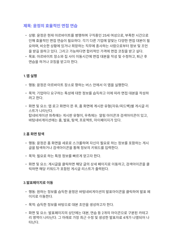여기서 새로운 니즈가 제안된 고윤정 페르소나에 모든 팀원이 공통되게 적은 니즈를 추가하여 사용자 시나리오를 작성하게 되었다.