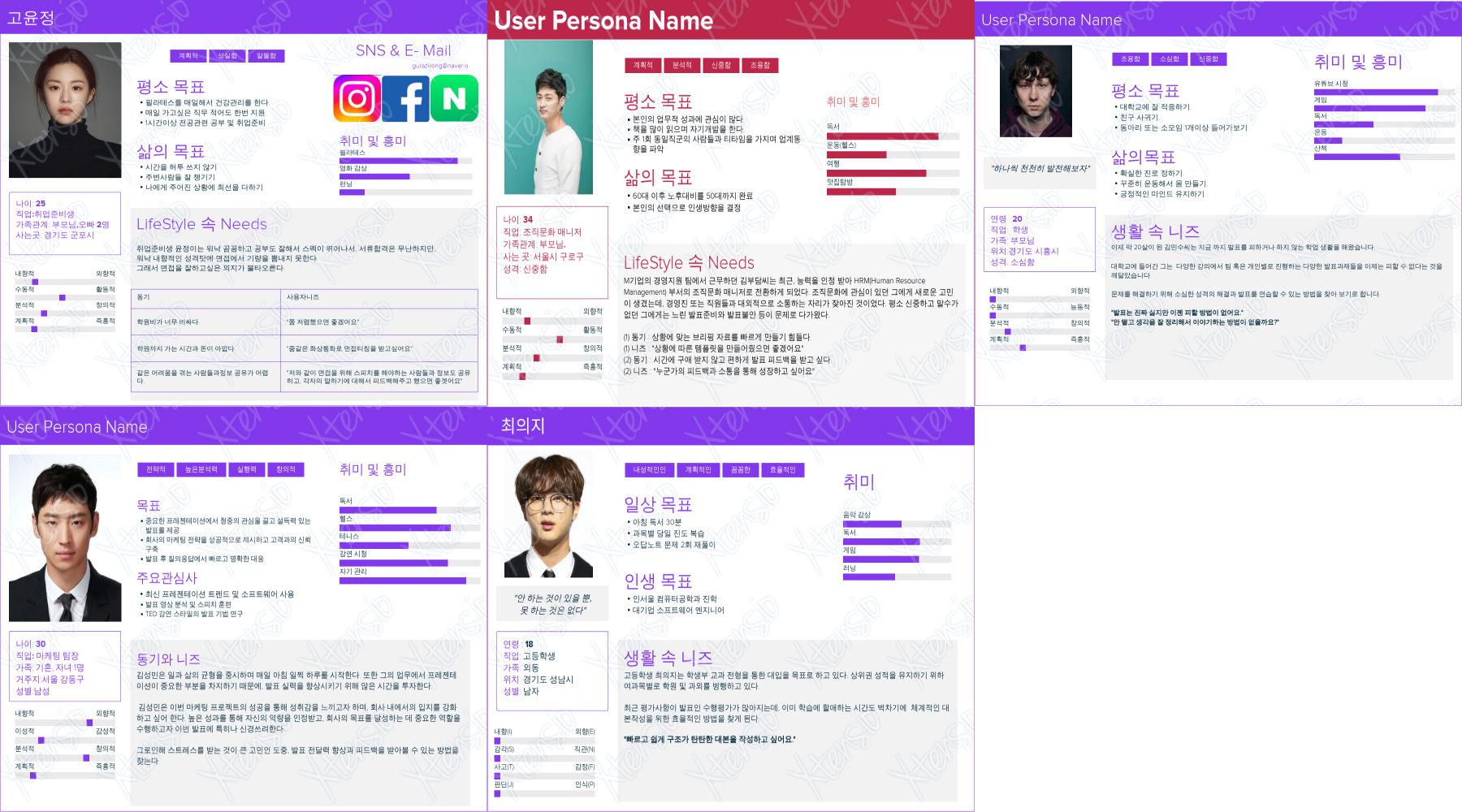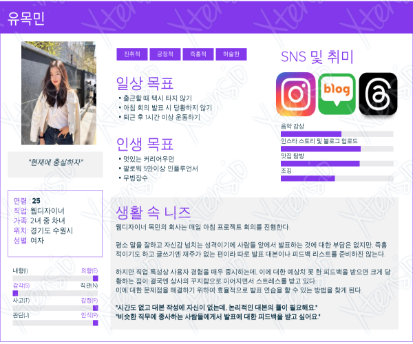 분석 결과를 참고하여 팀원과 각자 페르소나를 만들어보았다. 페르소나 템플릿은 이 웹사이트를 통해 사용할 수 있었다.
