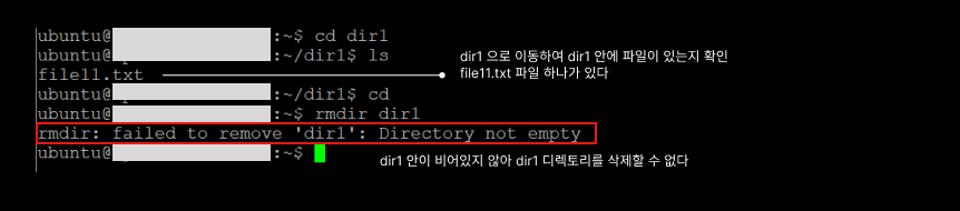 - 비어있던 test1 디렉토리는 삭제되지만 비어있지 않던 dir1 디렉토리는 삭제되지 않았다
